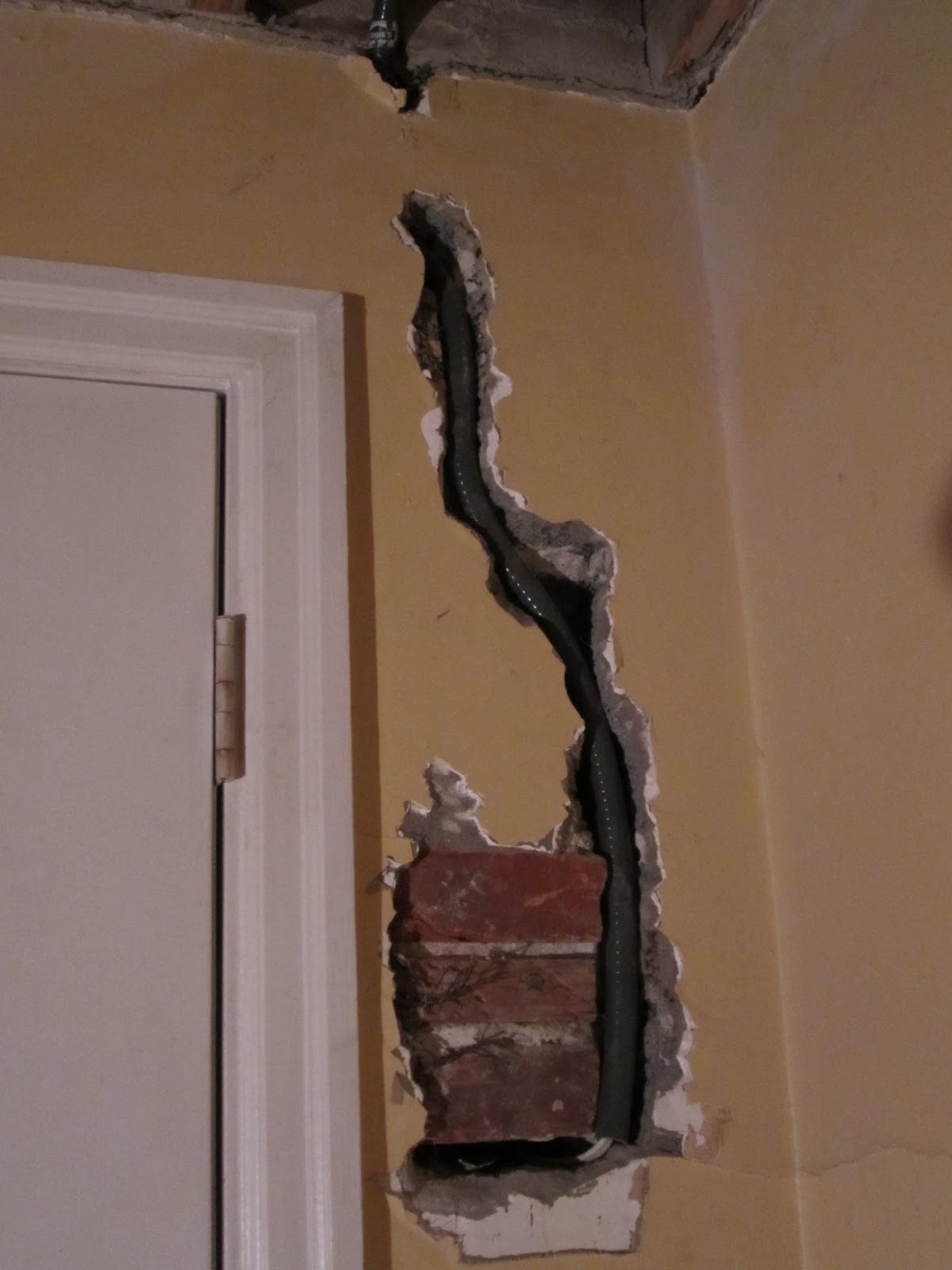 This created a minor issue. The wires were not easily accessible because the walls were tight masonry walls. In order to access the wires, Justin had to remove a portion of the wall.